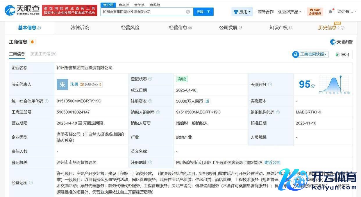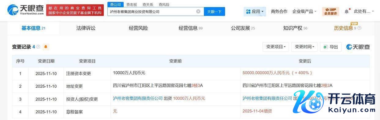 天眼查工商信息清楚,近日,泸州老窖集团买卖投资有限公司发生工商变更,注册本钱由1亿元东谈主民币增至5亿元东谈主民币,增幅400%。该公司建立于2025年4月,法定代表东谈主为朱勇,策画范围为房地产开发策画、开发工程施工、酒类策画、以自有资金从事投资行径、园区惩处处事、非居住房地产租借、住房租借、商务代理代办处事等。激动信息清楚,该公司由泸州老窖集团有限连累公司全资握股。值得一提的是,近期,泸州老窖本钱控股有限连累公司也发生工商变更,注册本钱由约15.3亿元东谈主民币增至约20.3亿元东谈主民币,增幅约33%,